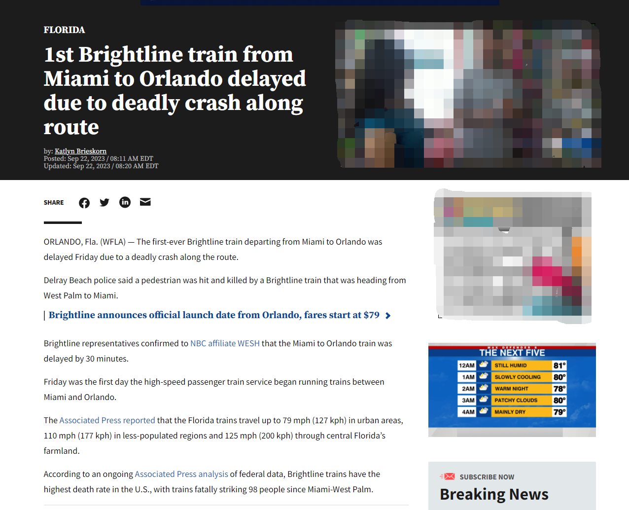 虽然线路距离短,而且速度顶天了就是动车组的水平,但Brightline却是全美国致死率最高的列车,不具备封闭线路运营条件是其中一大因素,许多事故发生在道口,记录显示,从2018年开始运营区区112公里长的局部线路起,Brightline已经撞死了多达98人,平均下来每个月都至少撞死1人以上。