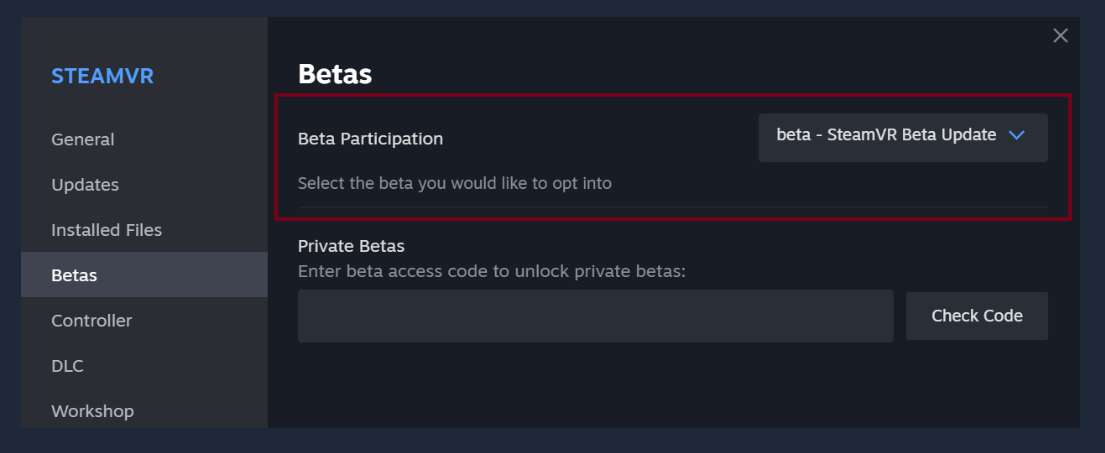 从下拉列表中选择“Beta – SteamVR Beta Update”即可