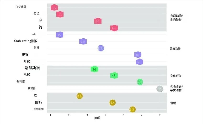 在一项针对68种鸟类和哺乳动物胃酸度和饮食的研究中发现,真正影响动物胃酸水平的是它们的饮食行为[1]。