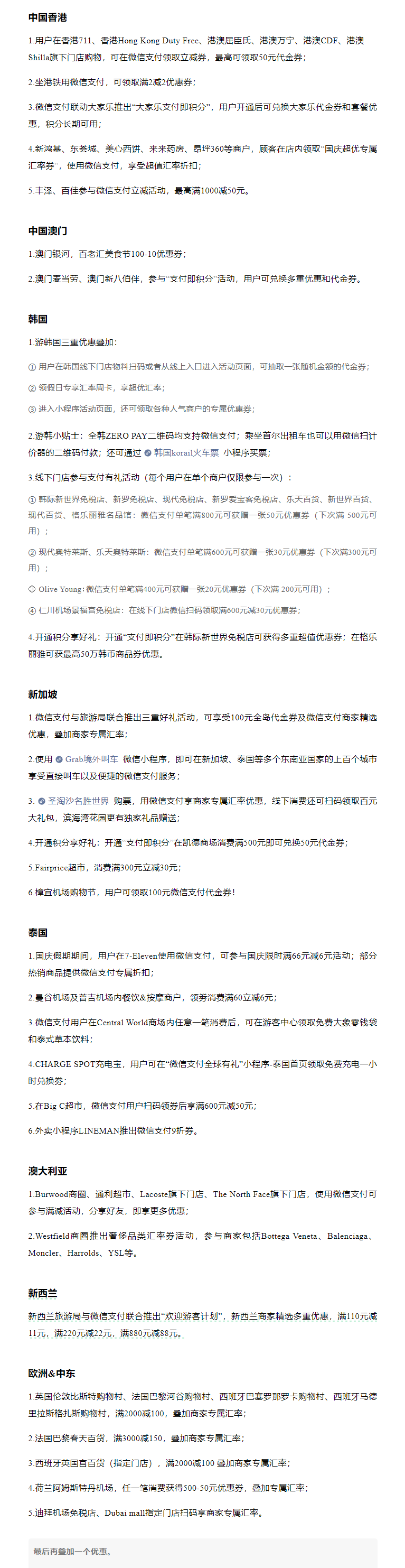 以中国香港为例,大家在香港711、香港Hong Kong Duty Free、港澳屈臣氏、港澳万宁、港澳CDF、港澳Shilla旗下门店购物,可在微信支付领取立减券,最高可领取50元代金券;