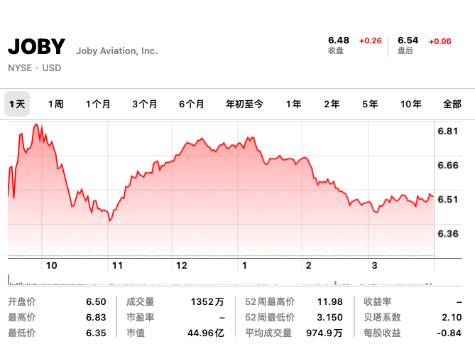 首个交易日中,Joby 的股价以10.62 美元开盘后一路飙升约20%。不过目前,其市值已经从当年的68亿美元缩水至44.96亿美元。
