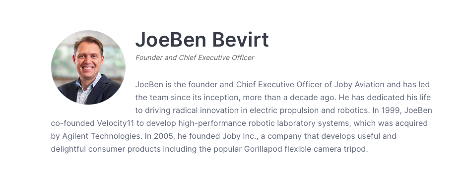 算起来,成立于2009年的Joby Aviation,已经经营了十多年,这是一家位于加利福尼亚州的航空公司,其创始人JoeBen Bevirt是位连续创业者,在创建Joby Aviation前,已经有了不少创业经历。