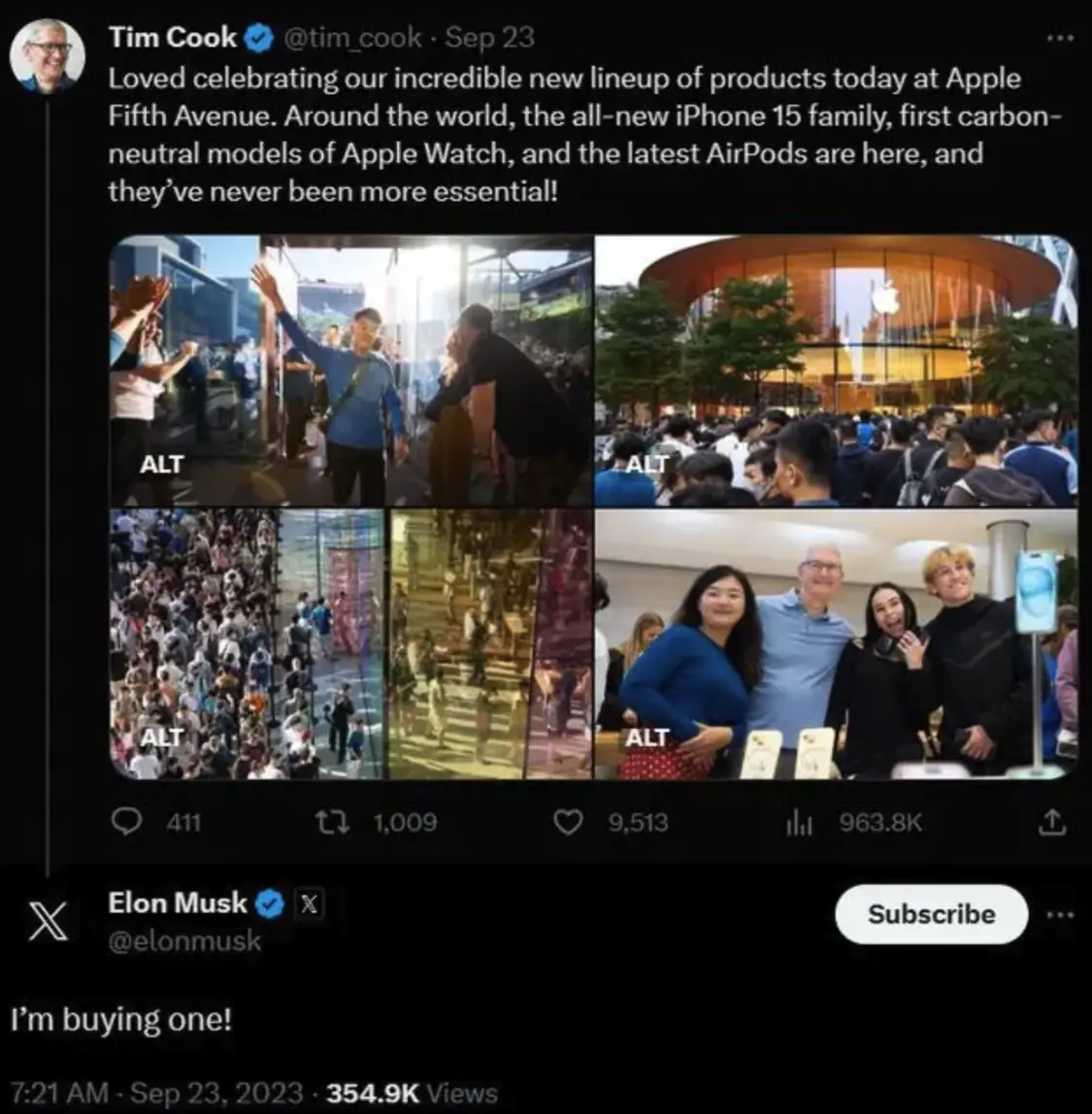 近日,马斯克还点赞了苹果CEOTim Cook(Tim Cook)分享的iPhone 15 Pro Max拍摄照片,称“iPhone的图片和视频美得令人难以置信”。他还在库克的帖子下留言称,“我要买一部”。