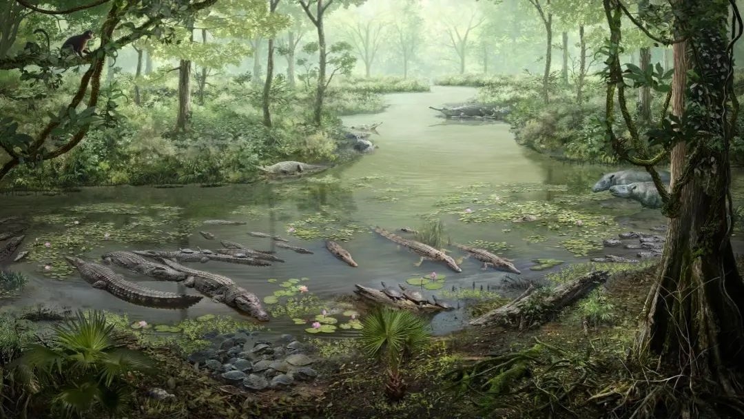 国际学术期刊《iScience》第 26 卷第 9 期的封面是一张治愈系风景画面,可以看到,茂密的森林草地中,一片宁静的池塘,好多鳄鱼吃饱了肚子,趴在浅水里休息。但你不知道的是,这张生态环境复原图的依据来自一堆鳄鱼的粪便化石。