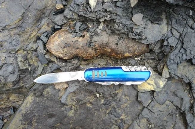 考察中发现原位埋藏的鳄鱼粪化石,图中化石的尺寸可以参考小刀的大小。图片来源:保罗