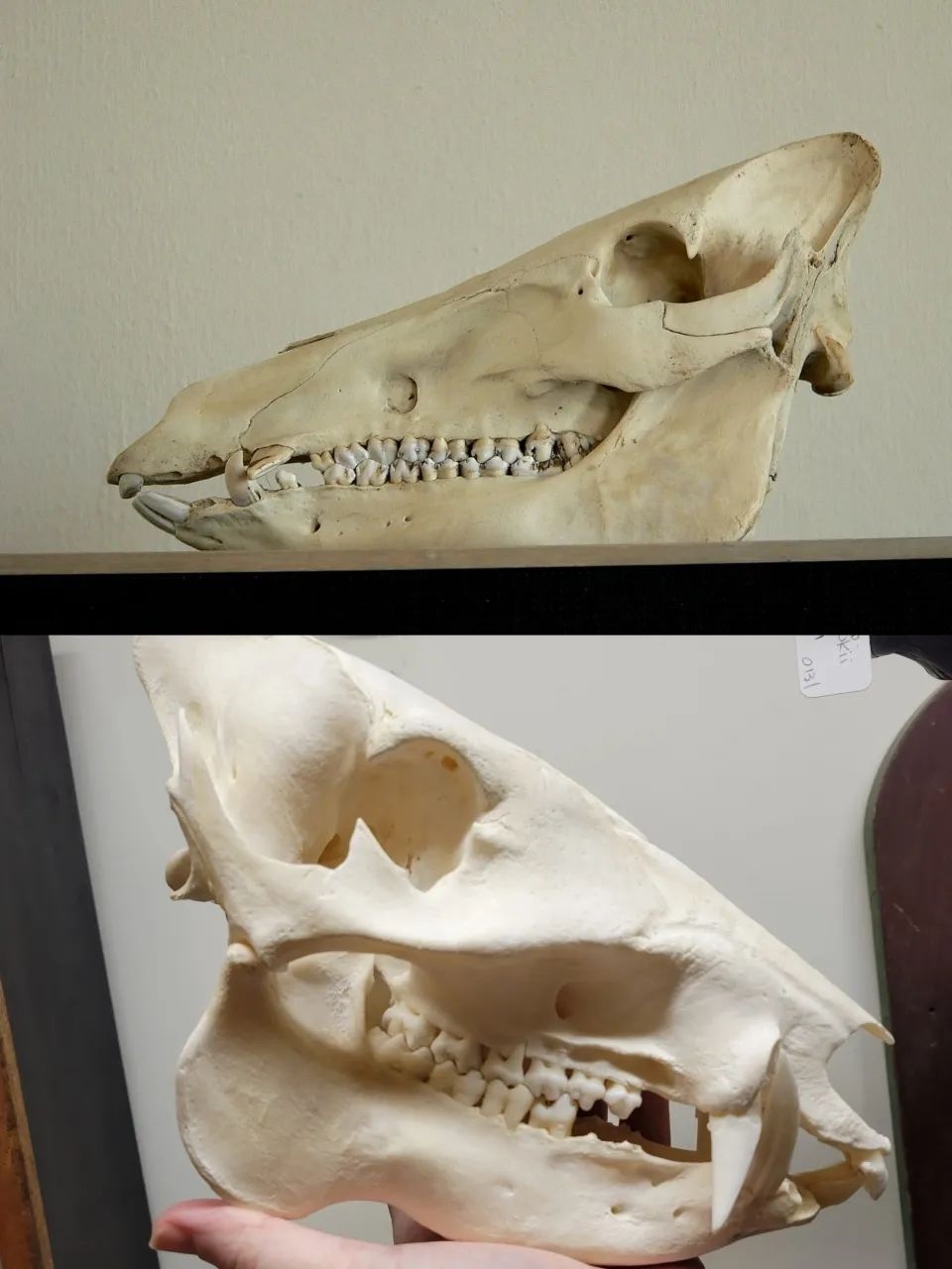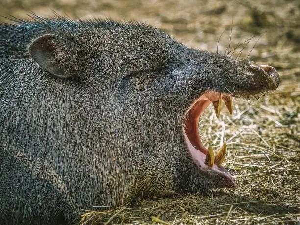 它们的牙齿也不一样,野猪的牙齿向外生长,是长且弯曲的獠牙,嘴巴闭上也很明显。