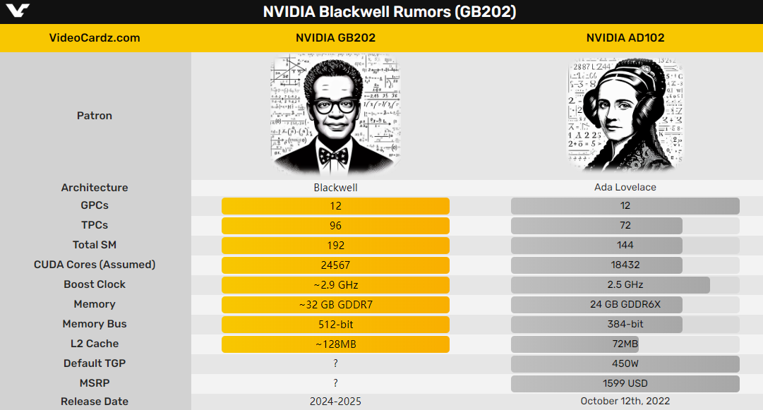 我们更感兴趣的还是游戏卡核心GB202,曝料称它和现在的AD102一样还是12组GPC,不过每组中的TPC从6个增加到8个。