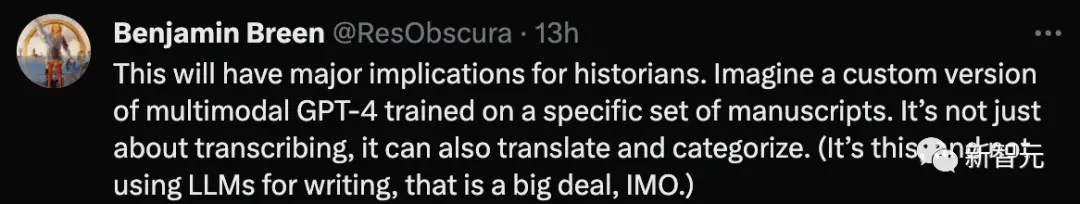 这将对历史学家产生重大影响。试想一下,一个定制的多模态GPT-4可以对一组特定的手稿进行训练。它不仅可以转录,还可以翻译和分类。(正是这一点,不使用LLM进行写作,在我看来才是一件大事)。