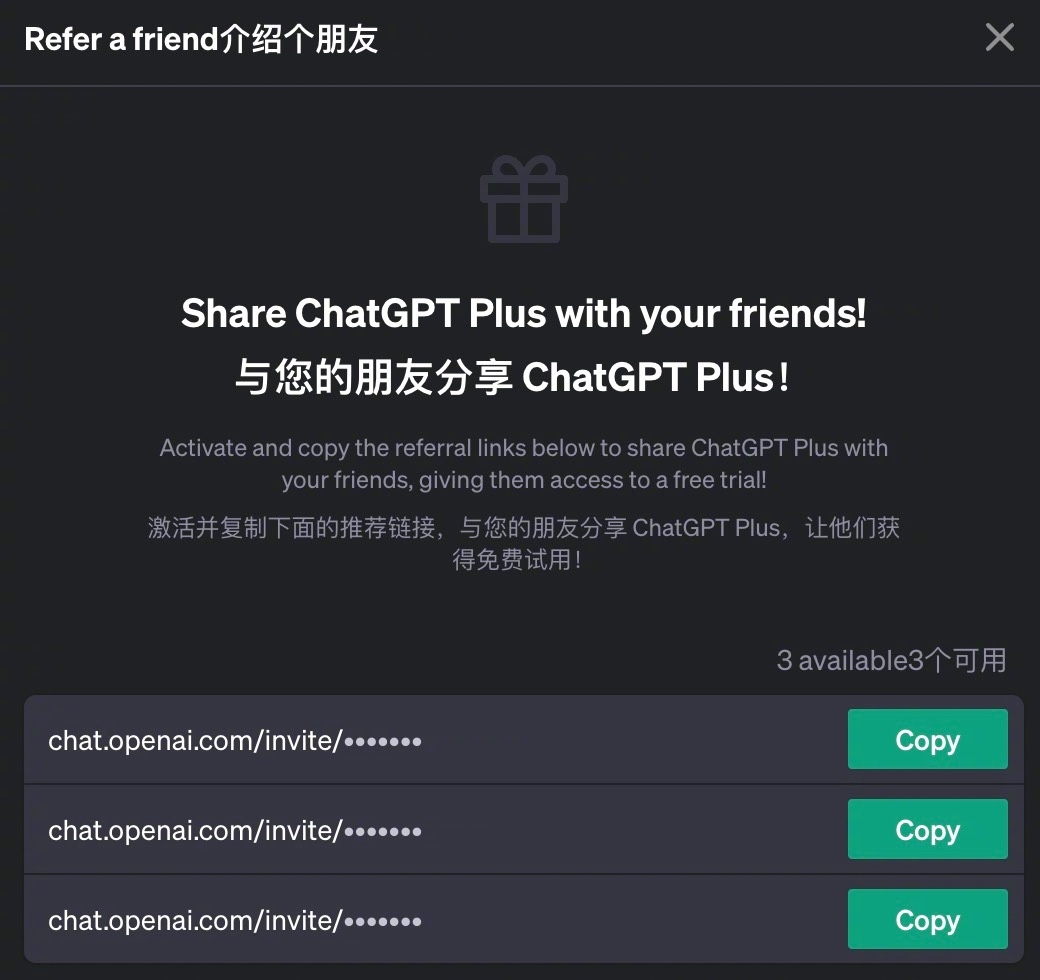 它带来的不止这几个福利,就有网友发现,付费用可以邀请3个免费用户来体验ChatGPT Plus。
