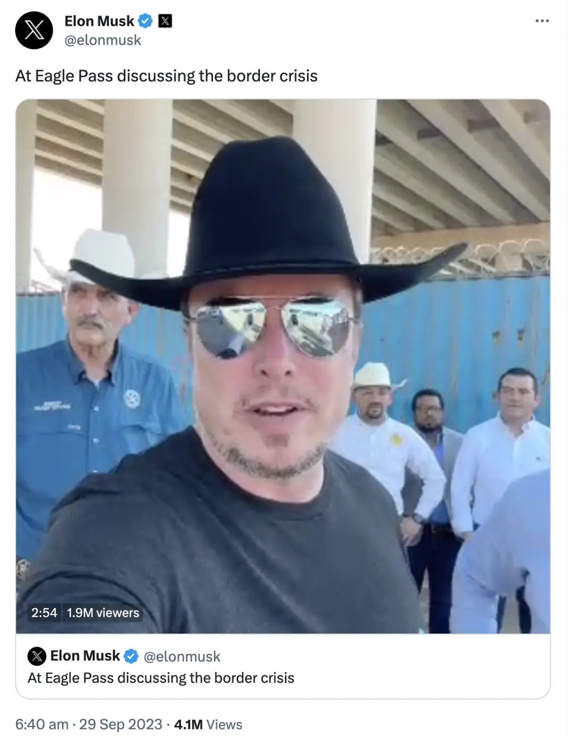 特斯拉公司CEO埃隆·马斯克(Elon Musk)周四到访美墨边境,并在X上大搞直播。尴尬的是,他刚刚直播了三分多钟就出现了技术故障,被迫中断。马斯克周四来到了得州边境小镇伊格尔帕斯(Eagle Pass),声称要讨论一下边境危机,亲自了解一下这里的移民问题。“作为一位美国移民,我非常支持移民。同样地,我们不应该允许那些违法的人进入我们的国家。”马斯克表示,他出生在南非。