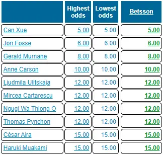 2023年诺贝尔文学奖候选人赔率Top 10;来源:Nicer Odds