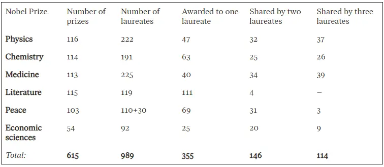 在世界范围内,诺贝尔奖被认为是所有颁奖领域内最具瞩目的权威国际大奖。1901年至2022年间,诺贝尔奖和经济科学奖共颁发了615次,共989名个人和组织获得,考虑到一些人多次获得诺贝尔奖,总共有954名个人和27个组织获奖。