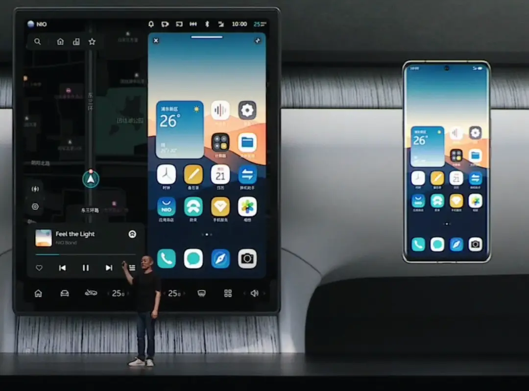当你在坐进车内的时候,蔚来手机可以完全映射到车机上,所有 APP 都能在车机端直接操作。同时,手机自身依然可以正常使用,相当于一部手机分身为二。