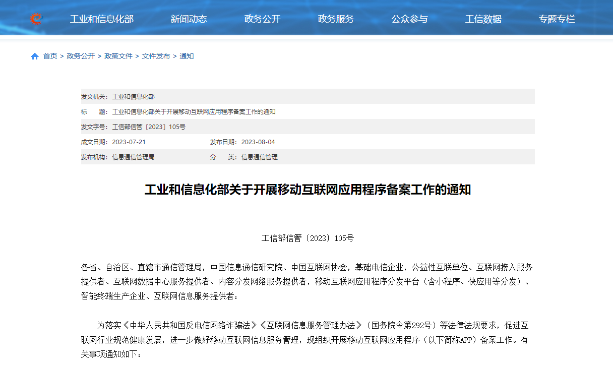 据了解,今年8月,工业和信息化部印发《工业和信息化部关于开展移动互联网应用程序备案工作的通知》(以下简称《通知》)。
