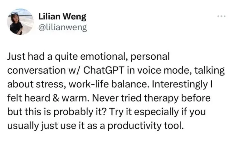 “有趣的是,我感到被倾听和温暖”,Lilian Weng在Twitter上说。她建议如果你原来只是把它当作一个生产力工具,那最好试试它细腻的一面。