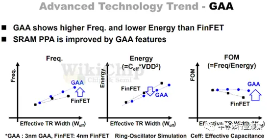 当然GAA的好处并不明显可能也是台积电的顾虑之一,三星此前谈到了3nm GAA制程,其比4nm FinFET在频率和功耗方面的优势,如下图所示,但图中并没有提供绝对值和相对值,其只是笼统地说,3nm GAA与4nm FinFET电晶体相比,在相同的有效通道宽度(Weff,fin/sheet的宽度× fin/sheet的个数)下,3nm GAA能够达成更高的频率;与此同时达成更低的功耗。