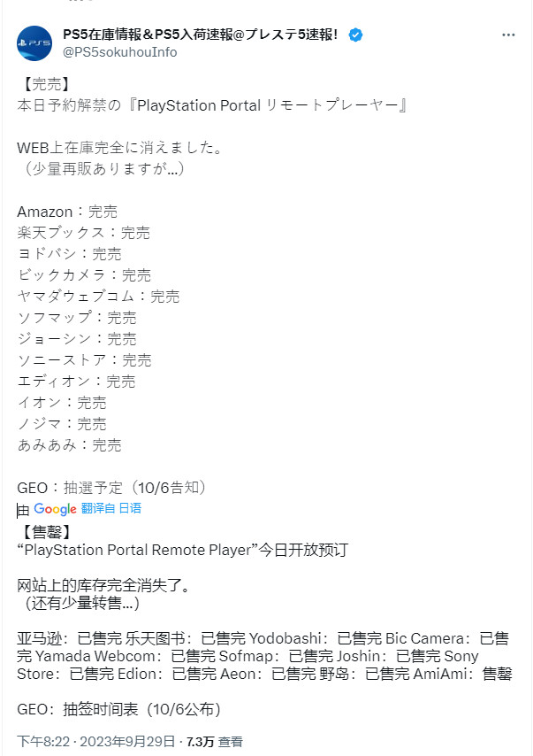 据报道,PlayStation Portal在几乎每个大型日本零售商那里都已经售罄,包括亚马逊,Rakuten Book,Yodobashi。