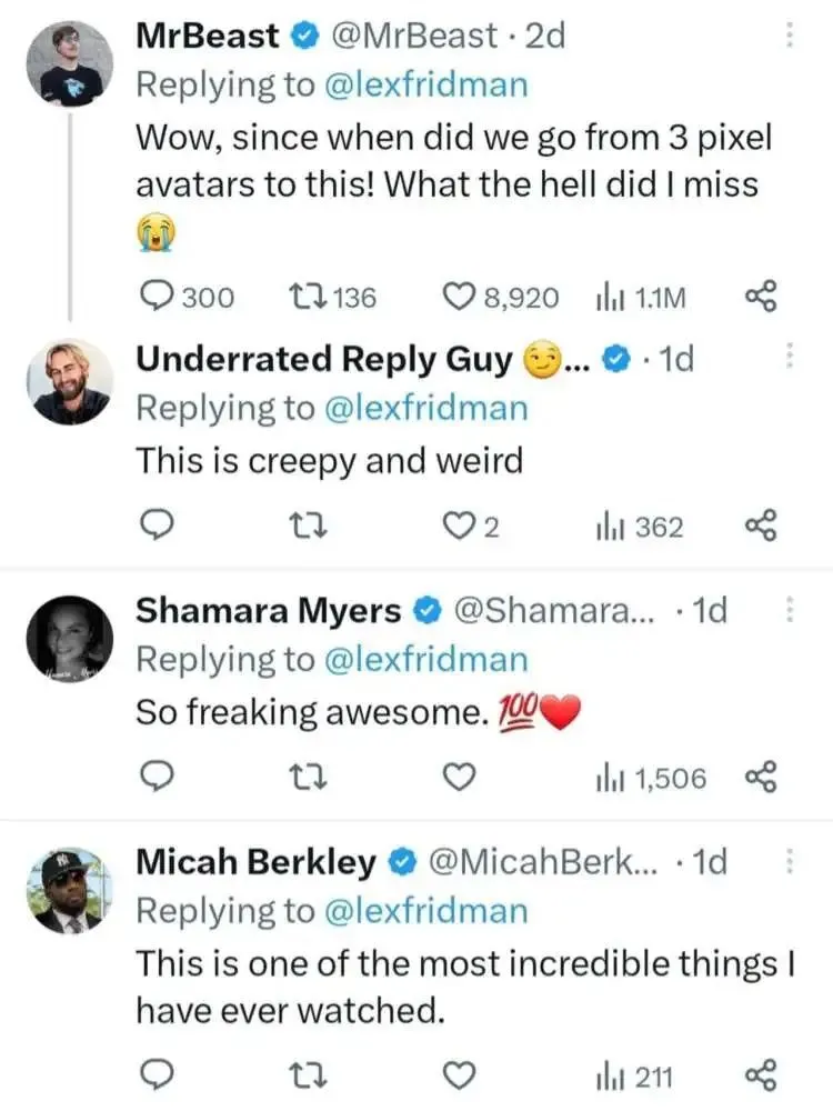 从采访视频来看,虚拟化身呈现出对真人细节的还原能力确实太强,用Lex的话说,“它捕捉到了一切,包括人脸上的缺陷。对我来说,这些缺陷正是人的微妙之处,这些小雀斑、皱纹、不对称的脸颊、笑的时候眼角的表情…它们让我更加享受其中,意识到完美并不是沉浸的关键。”