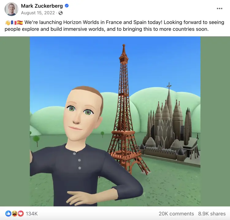 扎克伯格曾遭到“群嘲”的著名Horizon Worlds虚拟形象自拍,图片来自Facebook