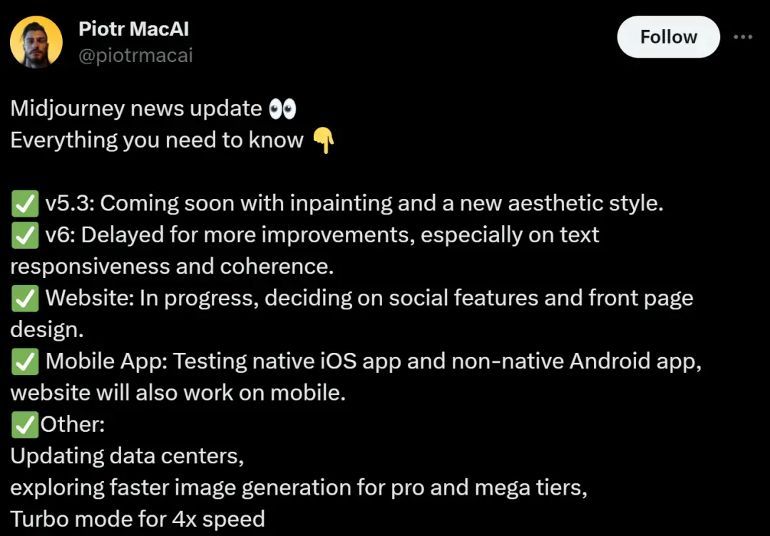 虽然现在Midjourney V6还没有正式推出,但网上已经有各种版本更新内容的小道消息了!