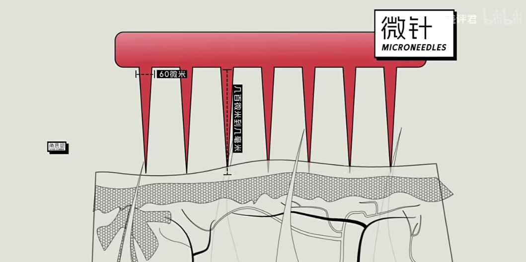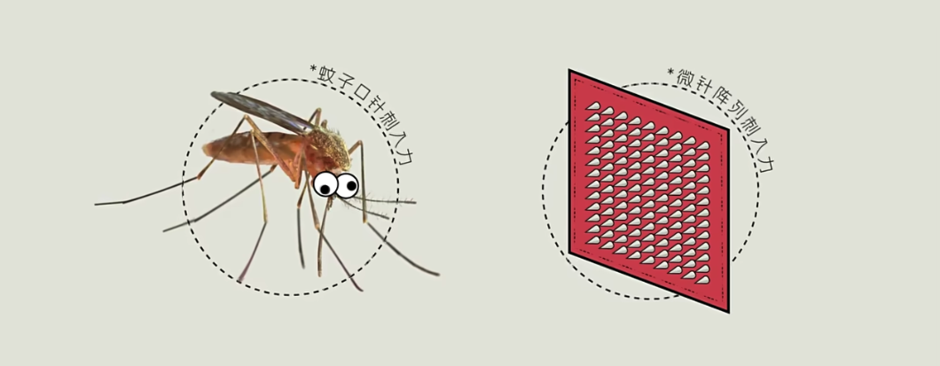这就不得不提到微针技术了。日本科学家神山文男受蚊子 “ 无痛吸血 ” 的启发,开发出一种极细的注射针头,直径只有 60 微米,将多个这样的微针阵列排布,就实现了药物的快速输送。