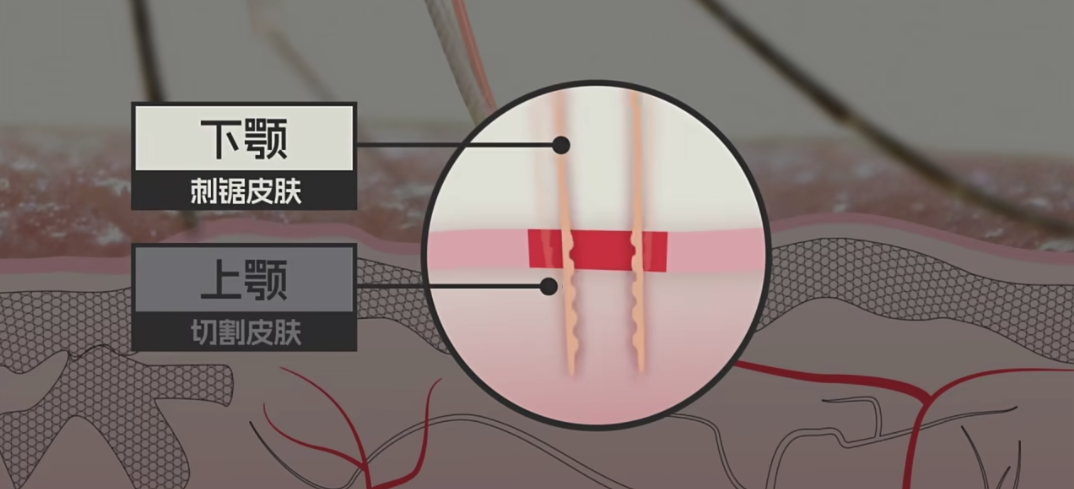 但蚊子并不能百分百找到血管,所以它的上颚和下颚就像一把瑞士军刀,用 10-15hz 的频率,反复的刺入和切割,在你的皮肉间游走,寻找合适的毛细血管。这个叮咬过程甚至会持续几分钟。终于,这只蚊子找到了目标血管,于是口器中心位置的两个管道,上唇和舌就开始工作了。