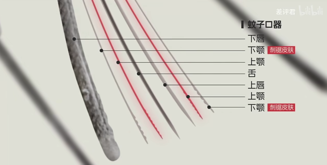 一对上颚,一对下颚,一个上唇,和一个舌。蚊子下颚的前段带有锯齿,它内柔外刚,越靠近尖端,表面硬度越高,负责刺锯皮肤,而上颚非常锐利,负责切割皮肤。舌头负责注入唾液,上唇负责吸血,而那个 “ 剑鞘 ”,也就是下唇,负责引导位置和撑开伤口。