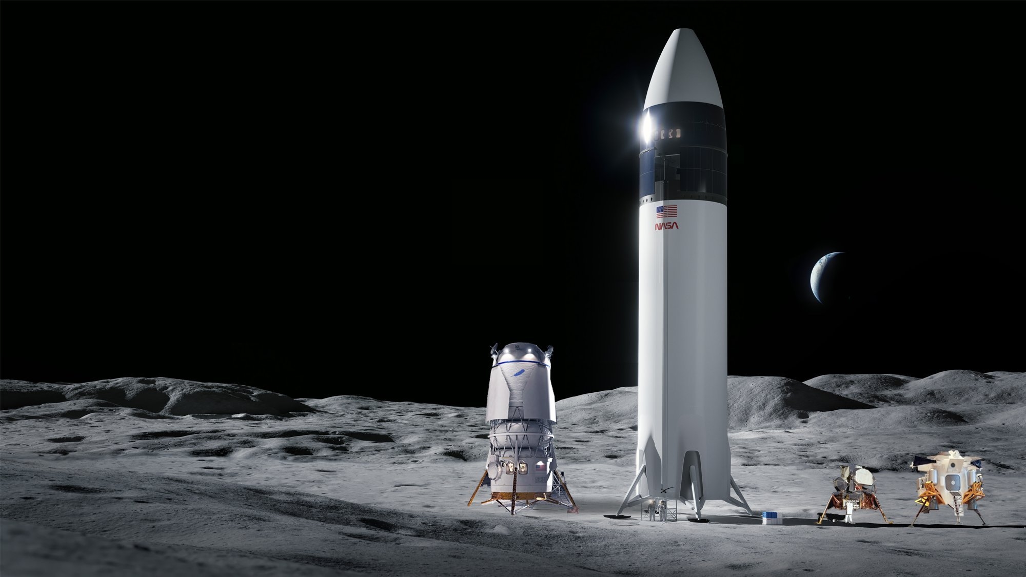 载人登月着陆器渲染图对比,图右开始看;中国载人登月着陆舱、美国“阿波罗”载人登月着陆舱、美国SpaceX“星舰”,美国蓝色起源“蓝月亮”登月着陆舱。