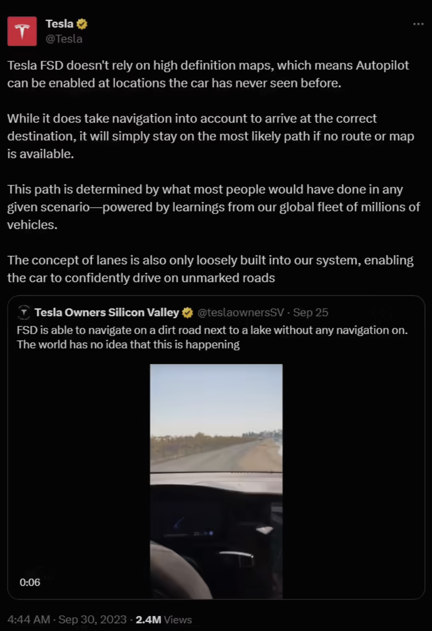 特斯拉表示:特斯拉 FSD 不依赖高清地图,这意味着 Autopilot 可以在汽车以前从未见过的地方启用。