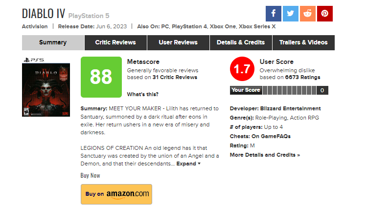 而在 M 站,暗黑4 的用户评分已经跌到了 1.7 分( 10分制 ),可以说是狗看了都摇头。