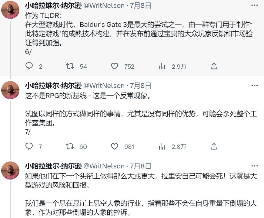 前阵子《 博德之门3 》的巨大成功引起了一大群业内人士的担忧,以 Strange Scaffold 工作室的 Xalavier Nelson 为首,许多人担心之后玩家们会以《 博德之门3 》作为 RPG 游戏的新标准。