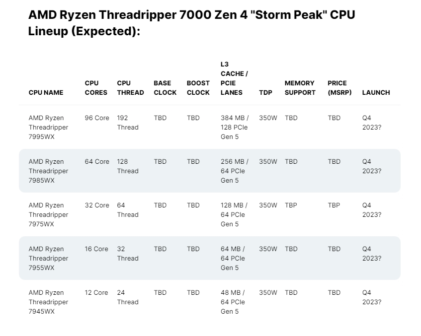 根据泄露的消息,预计线程撕裂者PRO 7000系列将提供5款型号(暂定),包括96核7995WX、64核7985WX、32核7975WX、16核7955WX和12核7945WX。
