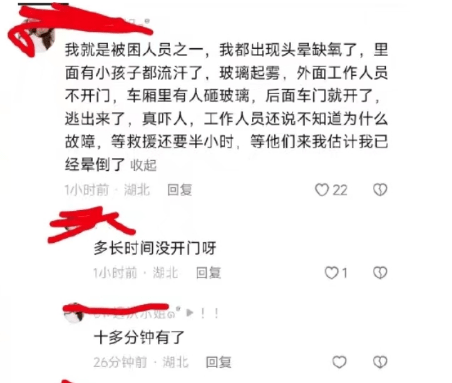 也有网友表示自己是被困人员之一被困了十多分钟,已经出现头晕缺氧,里面有小孩子都流汗了,玻璃起雾,外面工作人员不开门,车厢里有人砸玻璃,后面车门就开了,逃出来了。