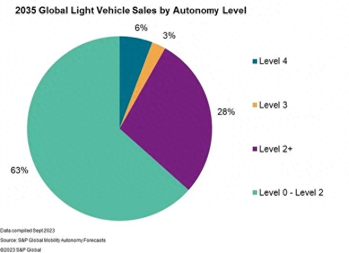 接下来,行业的主要关注点仍然是自动驾驶,而不是完全自动驾驶。据预测,到2035年,不同地区的众多主机厂,会广泛采用L2+级和L3级系统,这个比例至少占全球新车销量的31%。