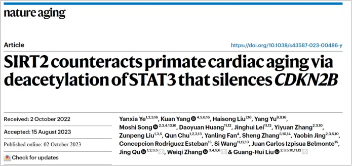 [1] Ye, Y., Yang, K., Liu, H. et al. SIRT2 counteracts primate cardiac aging via deacetylation of STAT3 that silences CDKN2B. Nat Aging (2023). https://doi.org/10.1038/s43587-023-00486-y