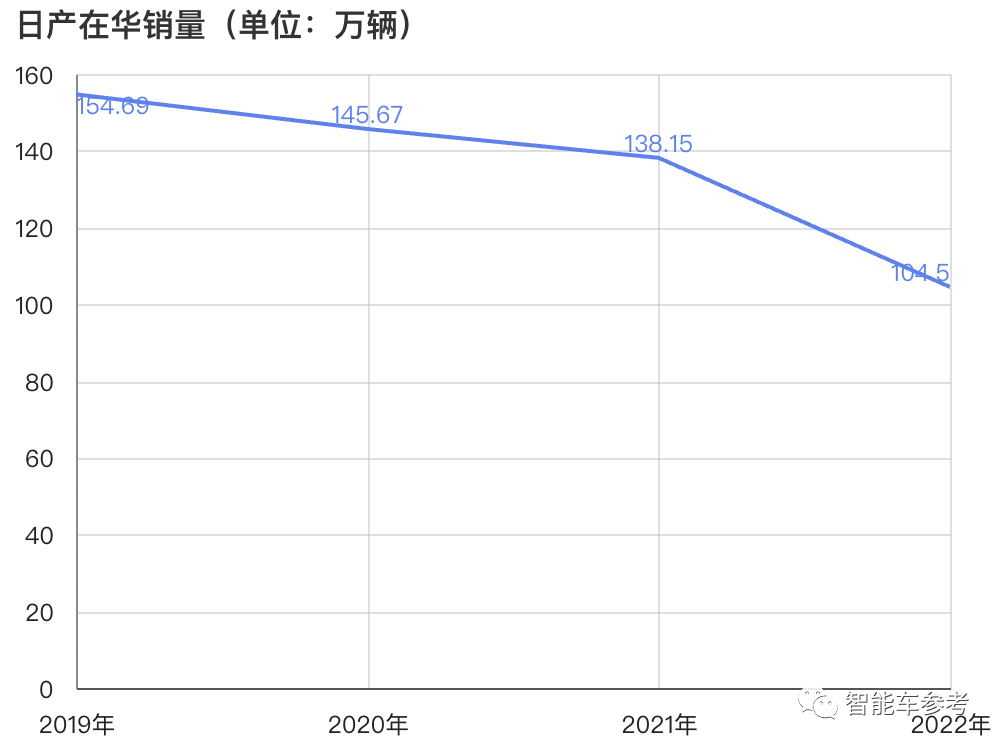 首先是自身成绩,2018、2019年是日产巅峰时期,销量超过150万,随后2020、2021、2022年销量分别为:145.67万、138.15万、104.5万。