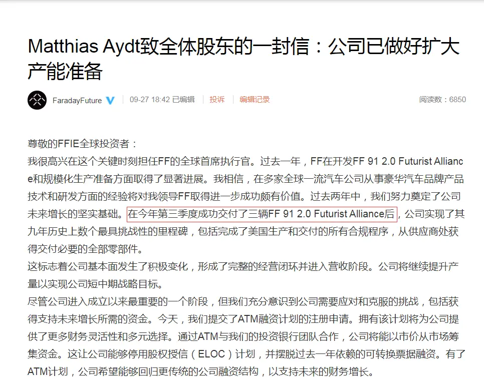 9月27日,FaradayFuture(法拉第未来,下称“FF”)官方公布了FF全球首席执行官Matthias Aydt致全体股东的一封信。
