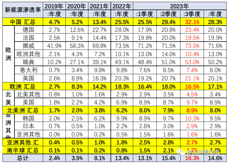 乘联会秘书长崔东树撰文分享了世界新能源车渗透率情况。数据显示,世界新能源车渗透率总体呈现快速提升趋势,2020年只有3.9%,2022年达到13%水平,2023年8月已经达到16.3%。不过,世界新能源发展的不均衡性极为明显。