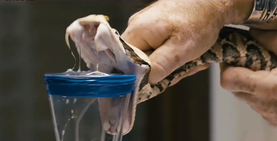 它们有一个共同点,那就是排毒量比较大。眼镜王蛇一次性排毒干重可达420 毫克,而加蓬蝰蛇一次性的排毒量更大,干重可达1000 毫克以上。