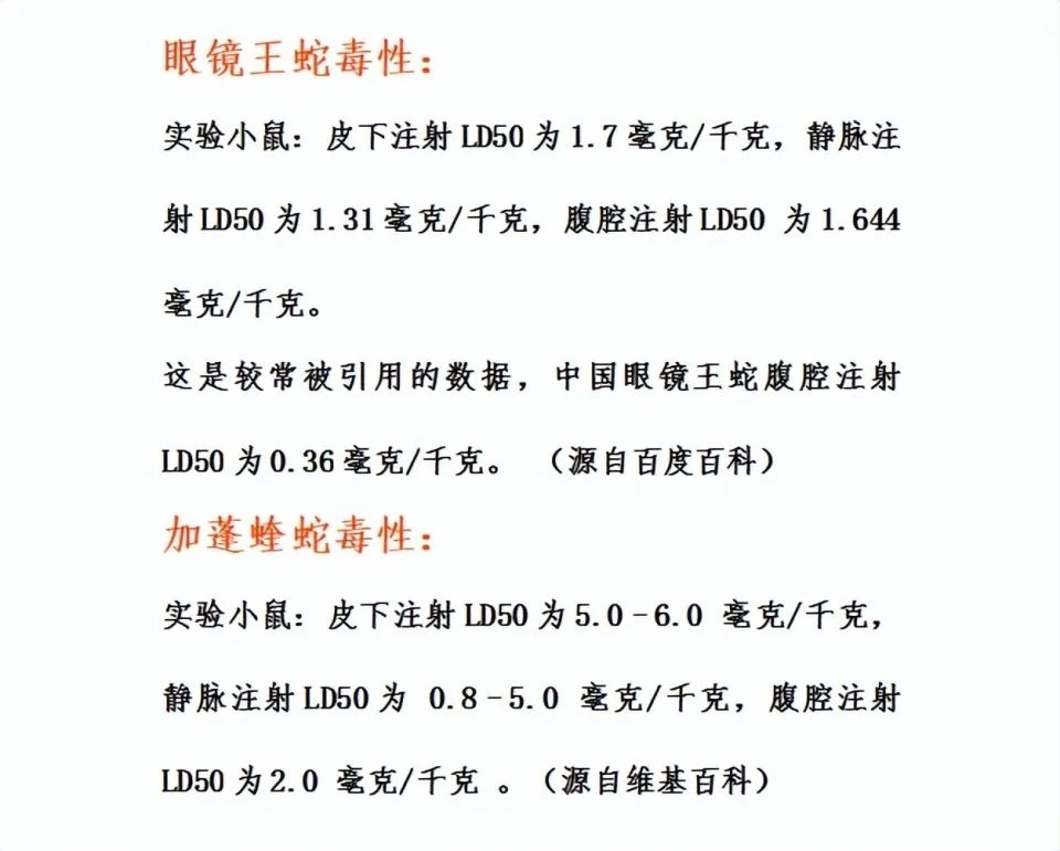 这意味着,若是皮下注射和腹腔注射,眼镜王蛇的LD50数据更小,毒性更强,若是静脉注射,那么加蓬蝰蛇致死率更高。
