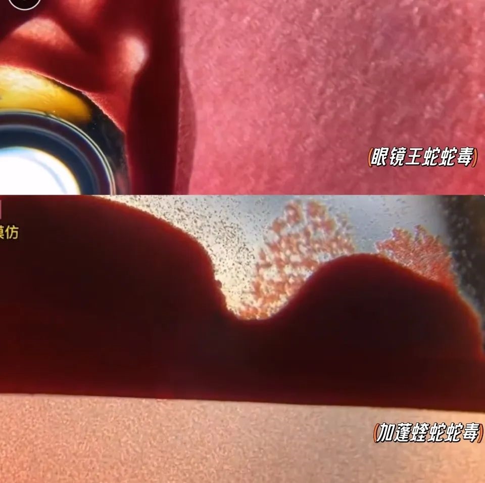 在显微镜下,研究人员在血液的边缘滴了一小滴眼镜王蛇毒液,瞬间人的血细胞就被蛇毒吸引,蛇毒和血液的交界处形成了深红色的血块。