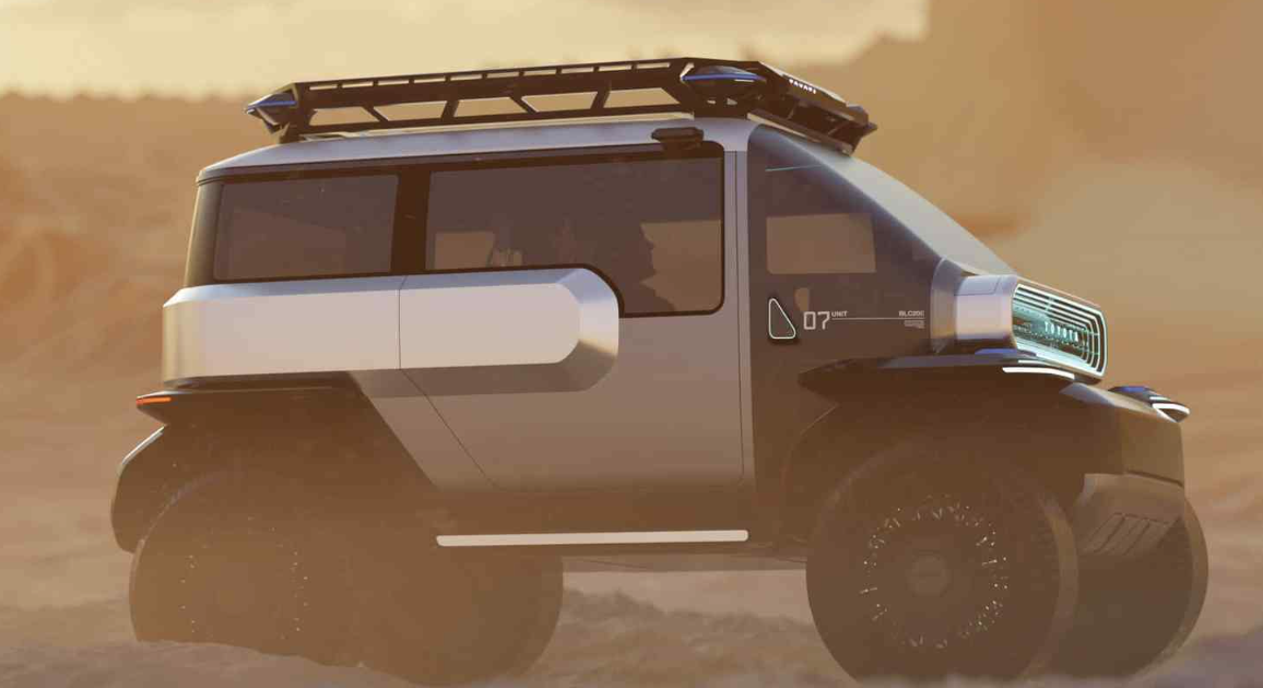 侧面来看,巨大的蜂窝轮胎十分显眼,值得一提的是,该车采用了蜂窝网状的弹性结构,代替了传统的充气轮胎结构,彻底避免了野外爆胎的风险。