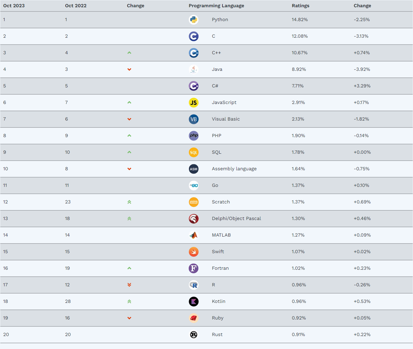 TIOBE发布了2023年10月的编程语言排行榜。榜单显示,Python和C依然占据着前两名。Python之所以能一直排在第一,主要是由于它是当今大学最常教授的第一语言,在统计领域排名第一,在人工智能编程领域排名第一,在脚本编写方面排名第一,在系统测试方面排名第一。除此之外,Python还在Web编程和科学计算方面处于领先地位。总之,Python无处不在。