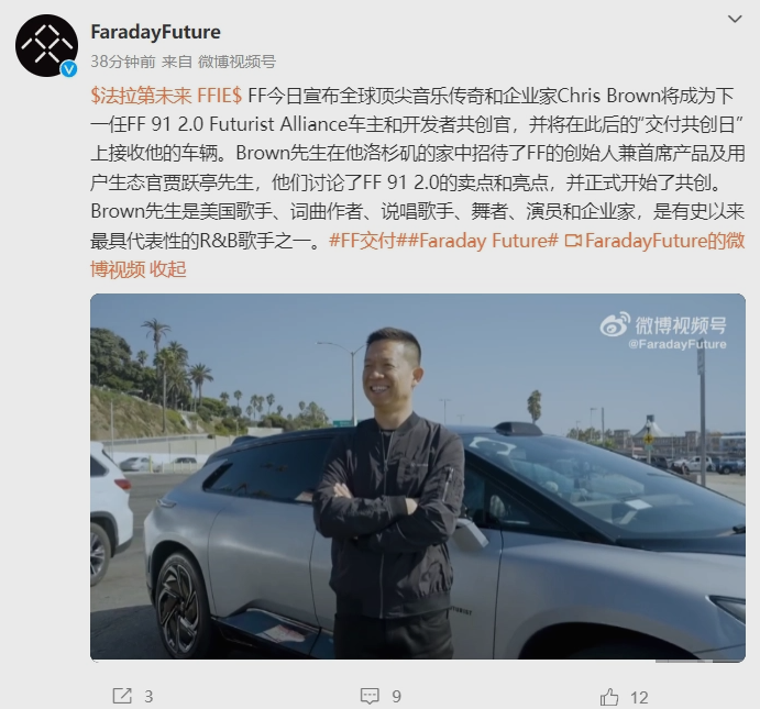 日前,法拉第未来在其官方微博表示:全球顶尖音乐传奇和企业家 Chris Brown 将成为下一任 FF912.0Futurist Alliance 车主和开发者共创官,并将在此后的“交付共创日”上接收他的车辆。
