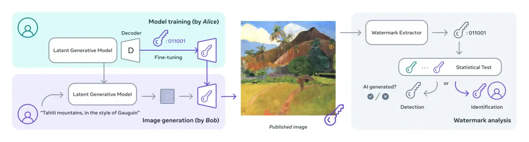 Alice 训练了一个主生成模型。在分发之前,她对模型的一小部分(称为解码器)进行了微调,从而为 Bob 生成给定的水印。该水印可以标识型号版本、公司、用户等。