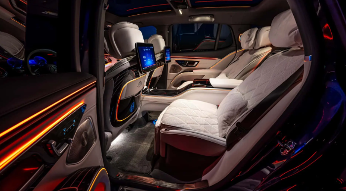来到后排,新车采用了两个独立的座椅,支持电动调节/加热/按摩等功能,而且每个座椅前方都有11.6英寸的娱乐屏,中央扶手位置还有一块三星的平板电脑。