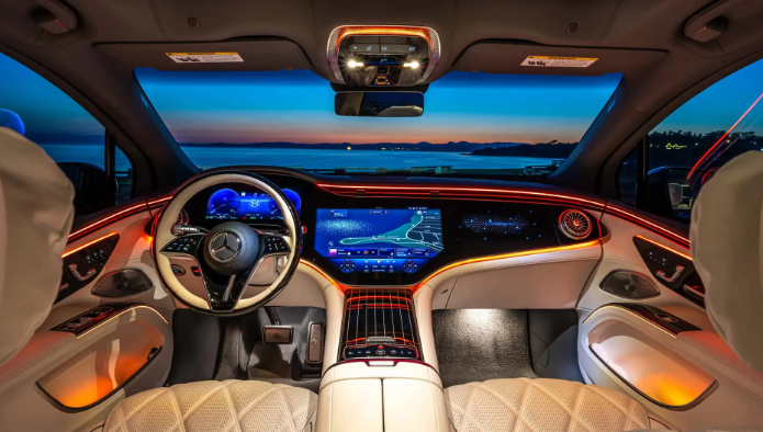 进入车内,整体布局也和奔驰EQS SUV保持一致,提供有三幅式多功能方向盘、12.3英寸全液晶仪表盘、17.7英寸内嵌式中控屏以及12.3英寸副驾驶娱乐屏。但与普通版EQS相比,该车的内饰在用料上要更胜一筹。