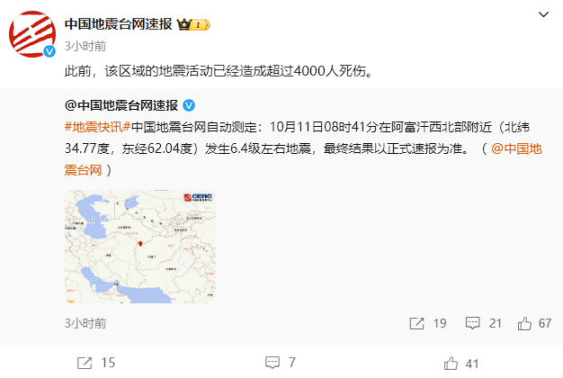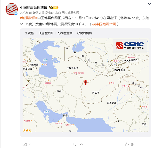 据悉,今日两次强震是10月7日以来当地震群序列的后续地震,而且同样是浅层逆冲断层造成的浅源地震(阿富汗的中源地震带位于兴都库什山区),这一震群的震中离阿富汗西北部重镇赫拉特非常近,加上先前地震已造成的灾情,很可能会有严重的次生灾害,愿平安。