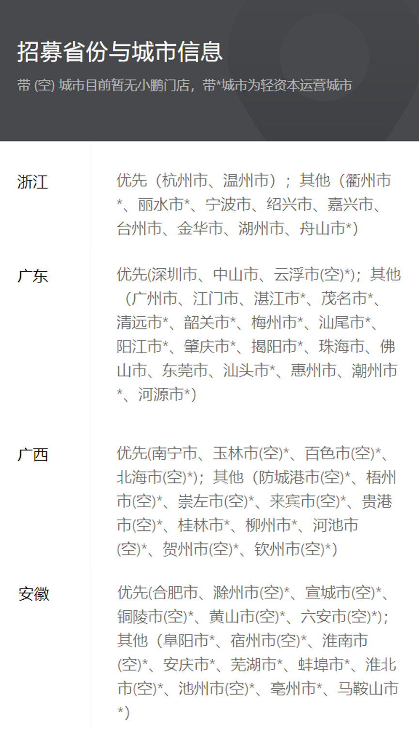 小鹏官网显示,在一二线城市密集的广东、浙江,几乎每个地级市都有小鹏网点;而在广西、安徽这些地方,只有两三个城市有网点。