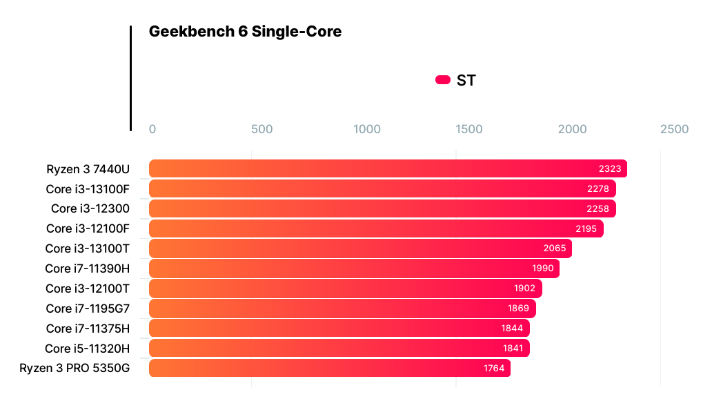 GeekBench 6实测它的单核跑分为2323,在众多四核心处理器中一直独秀,甚至超越了桌面上的i3-13100F、i3-12300。